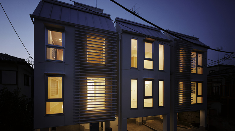 重量鉄骨造の利点を活かし、壁の配置を最小限にとどめ大空間を確保しました。 3棟の外観は統一性をもたせ、正面に設置したルーバーがアクセントとなり、視線を遮るスクリーンとなっています。 プランニングは3棟それぞれまったく異なった間取りにしており、スケルトン階段の家、 ラセン階段の家、中庭のある家と各々の棟で個性のある空間を演出しました。